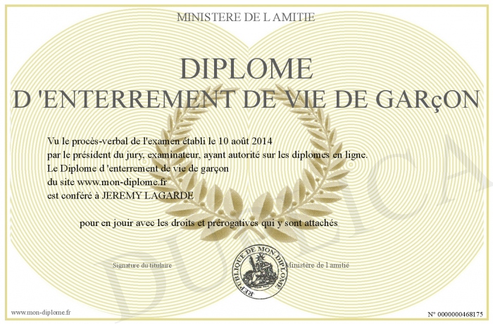 Envoyez par email votre Diplôme d 'enterrement de vie de garçon personalisé