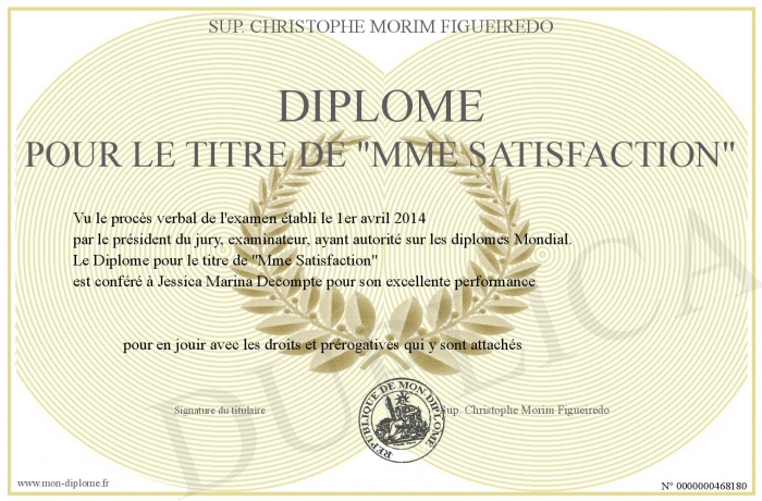 Envoyez par email votre Diplôme pour le titre de -Mme Satisfaction- personalisé