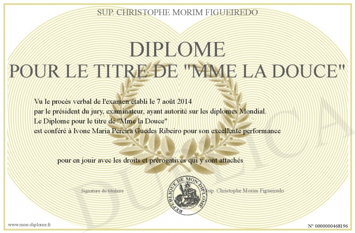 Envoyez par email votre Diplôme pour le titre de -Mme la Douce- personalisé