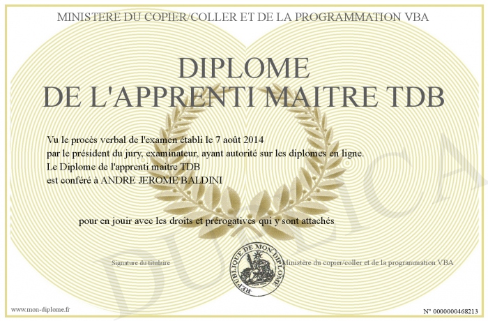 Envoyez par email votre Diplôme de l'apprenti maitre TDB personalisé
