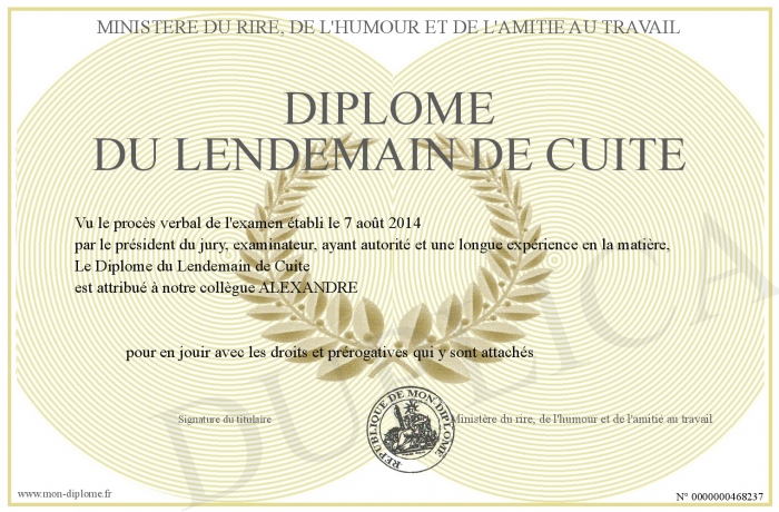 Envoyez par email votre Diplôme du Lendemain de Cuite personalisé