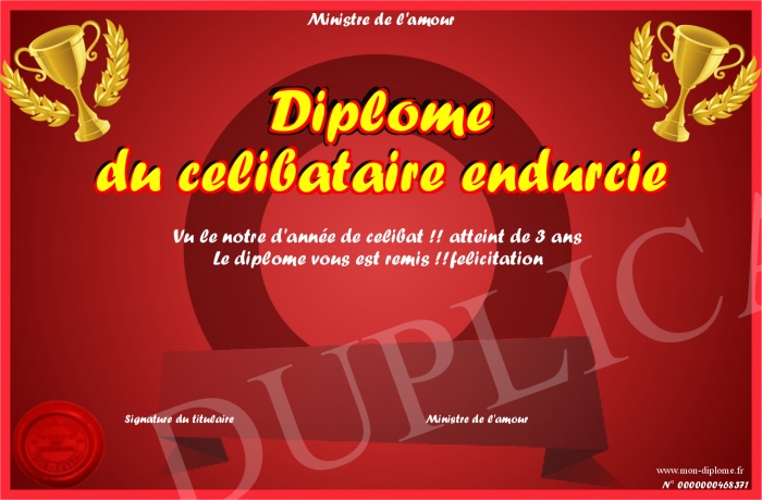 Envoyez par email votre Diplôme du celibataire endurcie personalisé