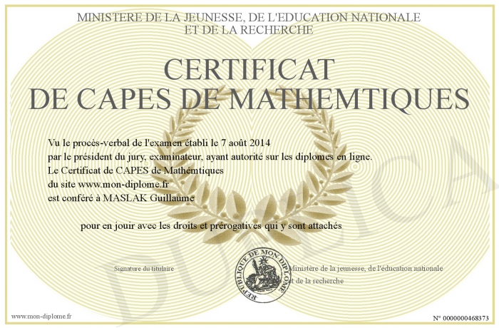 Envoyez par email votre Certificat de CAPES de Mathémtiques personalisé