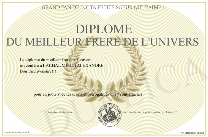 Envoyez par email votre Diplôme du meilleur frère de l'univers personalisé