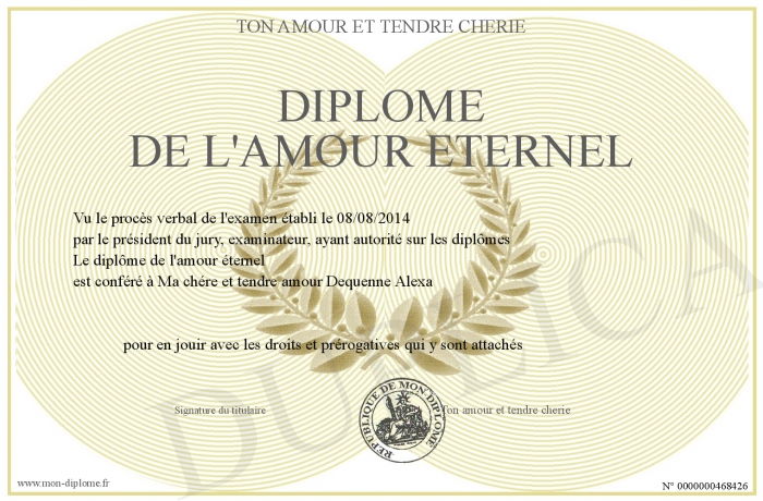 Envoyez par email votre Diplôme de l'amour eternel personalisé