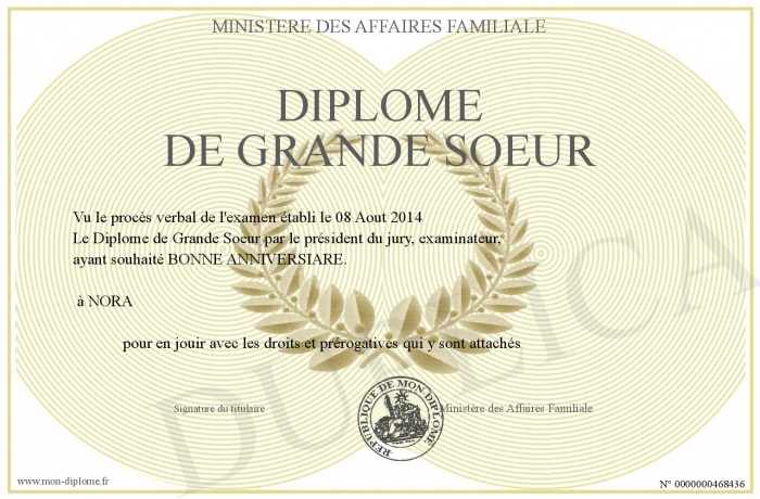 Envoyez par email votre Diplôme de Grande Soeur personalisé