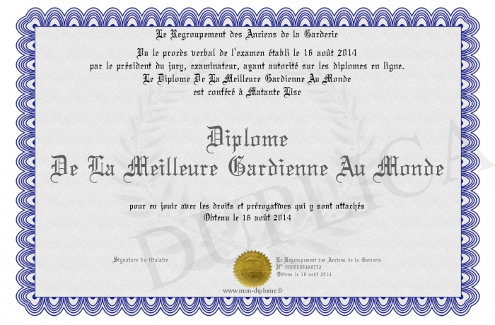 Envoyez par email votre Diplôme De La Meilleure Gardienne Au Monde personalisé