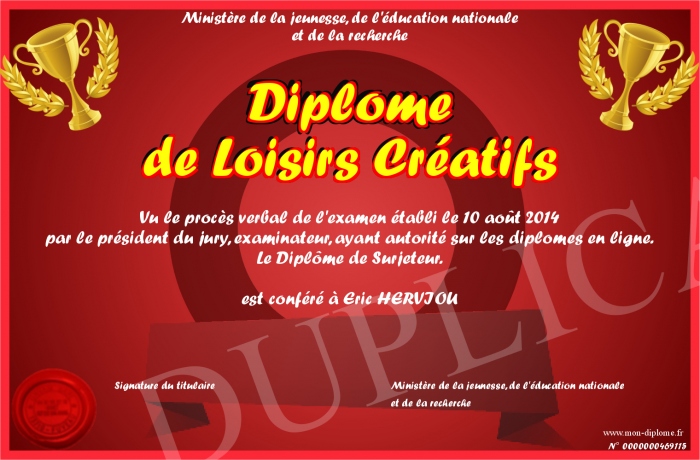 Envoyez par email votre Diplôme de Loisirs Créatifs personalisé