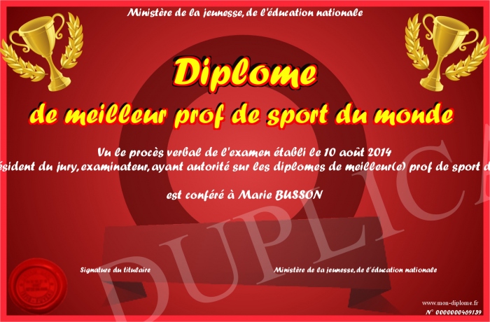 Envoyez par email votre Diplome de meilleur prof de sport du monde personalisé