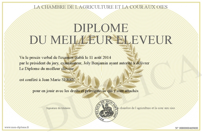 Envoyez par email votre Diplôme du meilleur éleveur personalisé