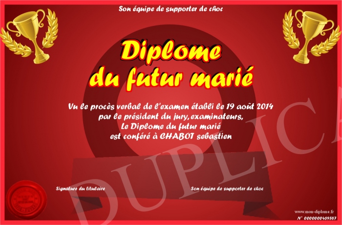 Envoyez par email votre Diplôme du futur marié personalisé
