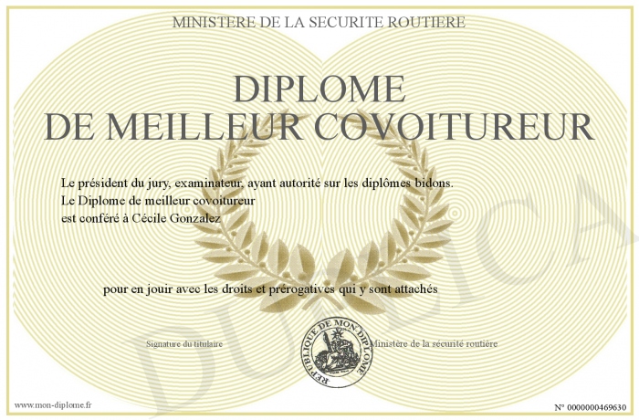 Envoyez par email votre Diplôme de meilleur covoitureur personalisé