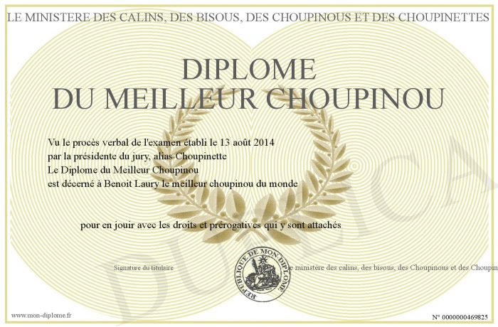Envoyez par email votre Diplôme du Meilleur Choupinou personalisé