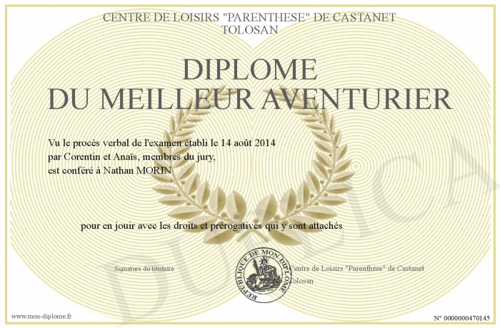 Envoyez par email votre Diplôme du Meilleur Aventurier personalisé
