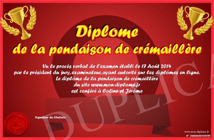 Envoyez par email votre Diplôme de la pendaison de crémaillère personalisé