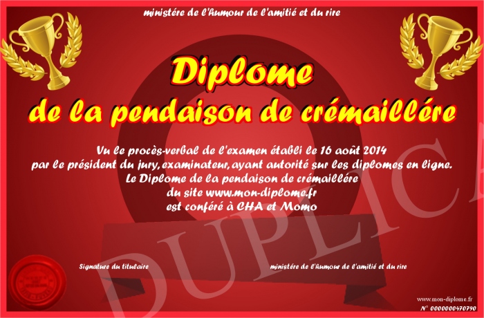 Envoyez par email votre Diplôme de la pendaison de crémaillére personalisé