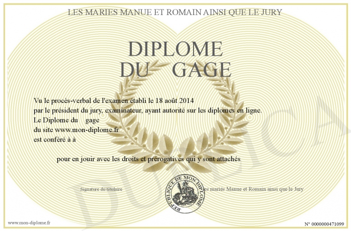 Envoyez par email votre Diplôme du gage personalisé