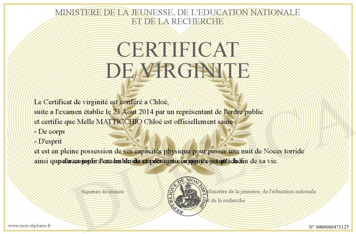 Envoyez par email votre Certificat de virginité personalisé