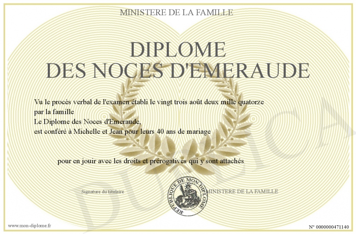 Envoyez par email votre Diplôme des Noces d'Emeraude personalisé