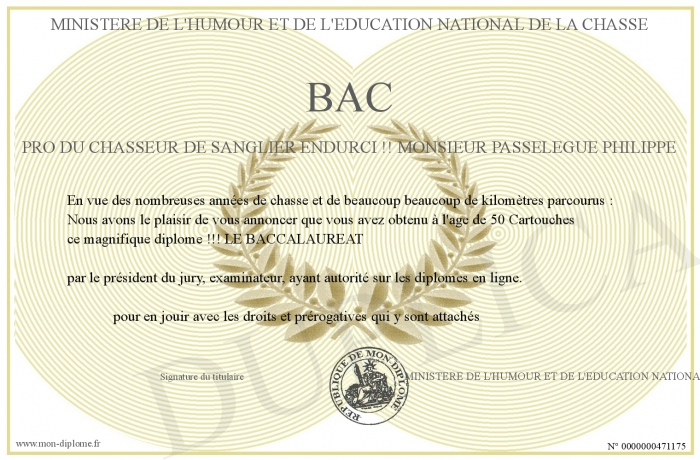 Envoyez par email votre BAC PRO DU CHASSEUR DE SANGLIER ENDURCI !! Monsieur Passelegue Philippe personalisé