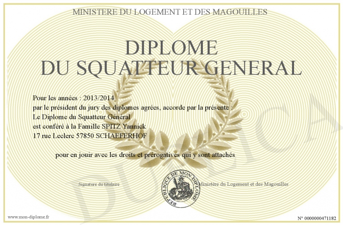 Envoyez par email votre Diplôme du Squatteur Général personalisé