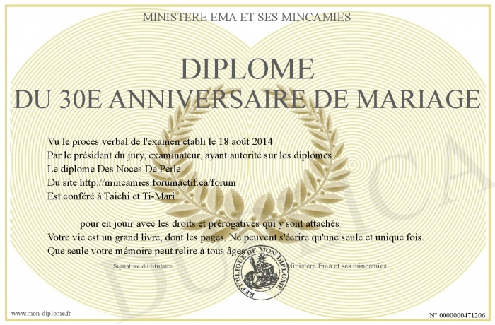 Envoyez par email votre Diplôme du 30e anniversaire de mariage personalisé
