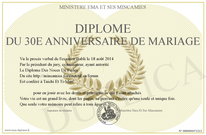 Envoyez par email votre Diplôme du 30e Anniversaire De Mariage personalisé