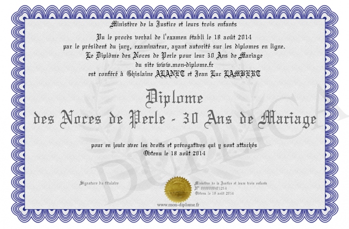 Envoyez par email votre Diplôme des Noces de Perle - 30 Ans de Mariage personalisé