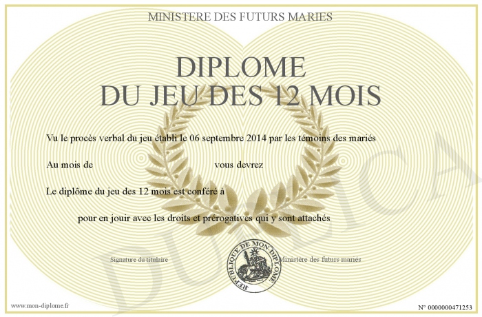 Envoyez par email votre Diplôme du jeu des 12 mois personalisé