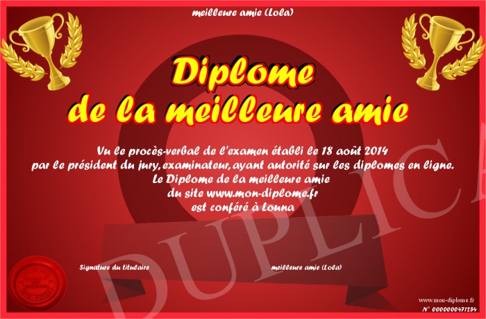 Envoyez par email votre Diplôme de la meilleure amie personalisé
