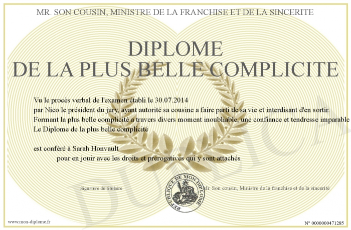 Envoyez par email votre Diplôme de la plus belle complicité personalisé