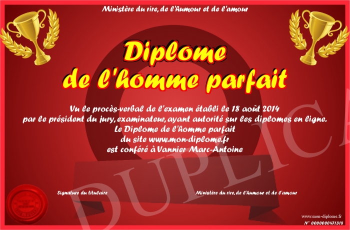 Envoyez par email votre Diplome de l'homme parfait personalisé