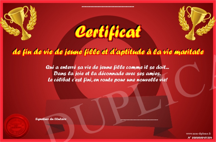 Envoyez par email votre Certificat de fin de vie de jeune fille et d'aptitude à la vie maritale personalisé