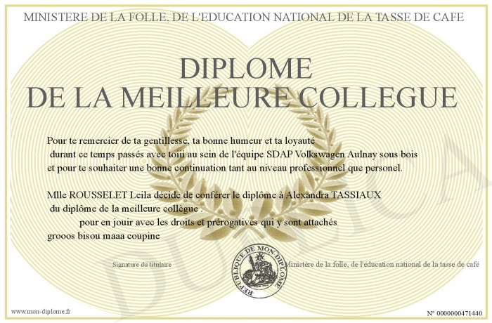 Envoyez par email votre Diplôme de la meilleure collègue personalisé