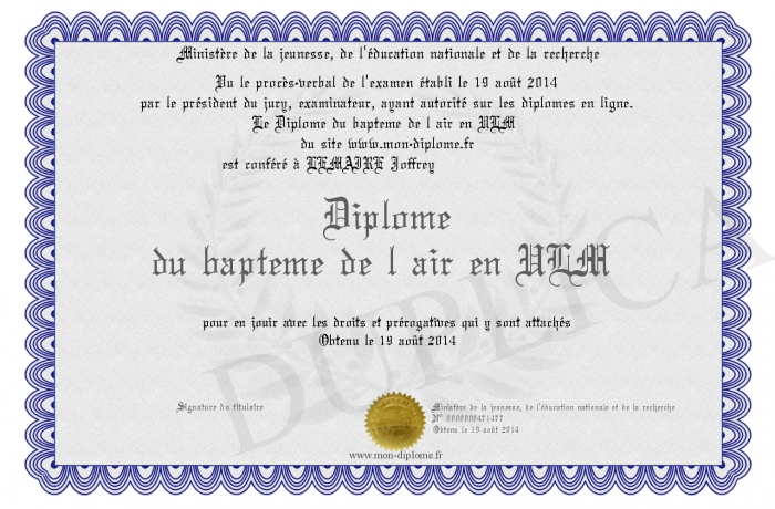 Envoyez par email votre Diplôme du bapteme de l air en ULM personalisé