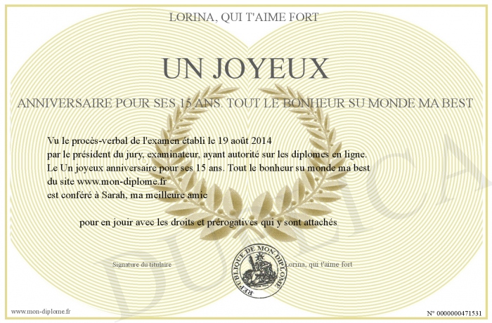 Envoyez par email votre Un joyeux anniversaire pour ses 15 ans. Tout le bonheur su monde ma best personalisé