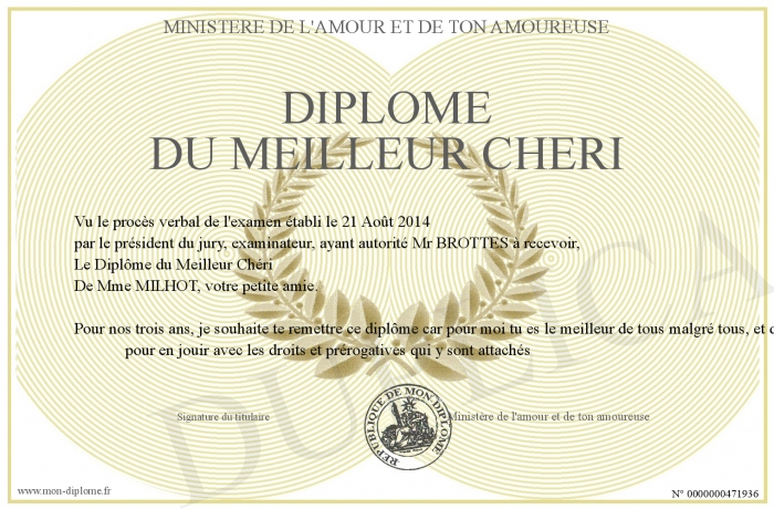 Envoyez par email votre Diplôme du Meilleur Chéri personalisé