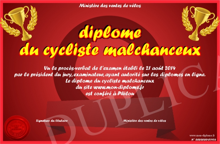 Envoyez par email votre diplôme du cycliste malchanceux personalisé