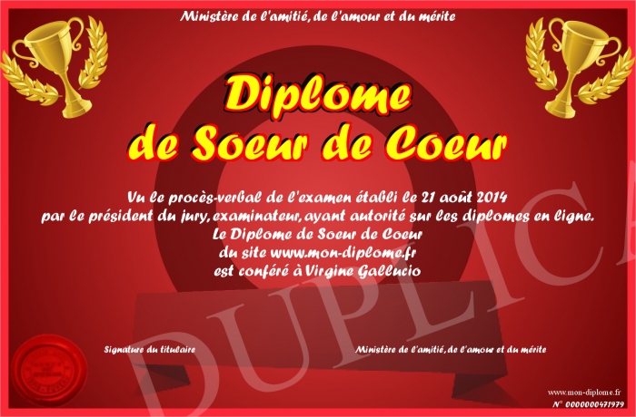 Envoyez par email votre Diplôme de Soeur de Coeur personalisé