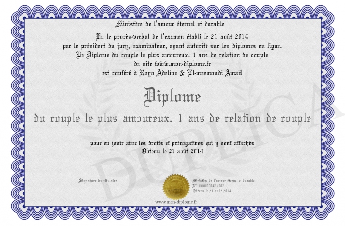 Envoyez par email votre Diplome du couple le plus amoureux. 1 ans de relation de couple personalisé