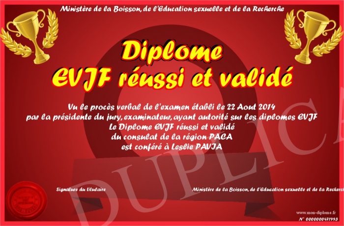 Envoyez par email votre Diplôme EVJF réussi et validé personalisé