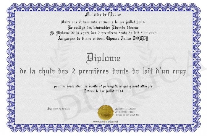 Envoyez par email votre Diplôme de la chute des 2 premières dents de lait d'un coup personalisé
