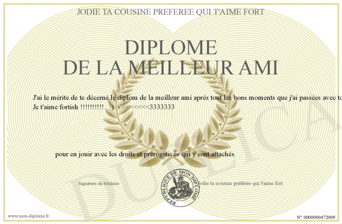 Envoyez par email votre Diplôme de la meilleur ami personalisé