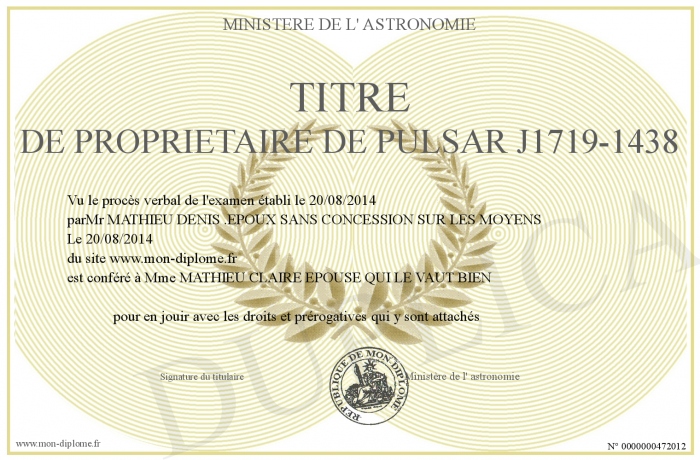 Envoyez par email votre TITRE DE PROPRIETAIRE DE PULSAR J1719-1438 personalisé