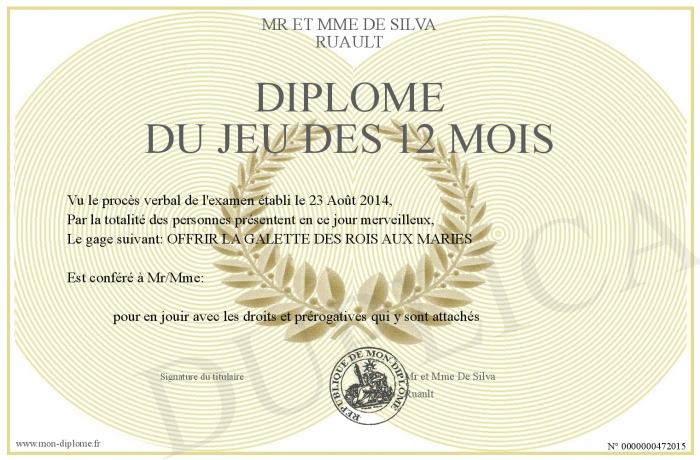 Envoyez par email votre Diplome du jeu des 12 mois personalisé