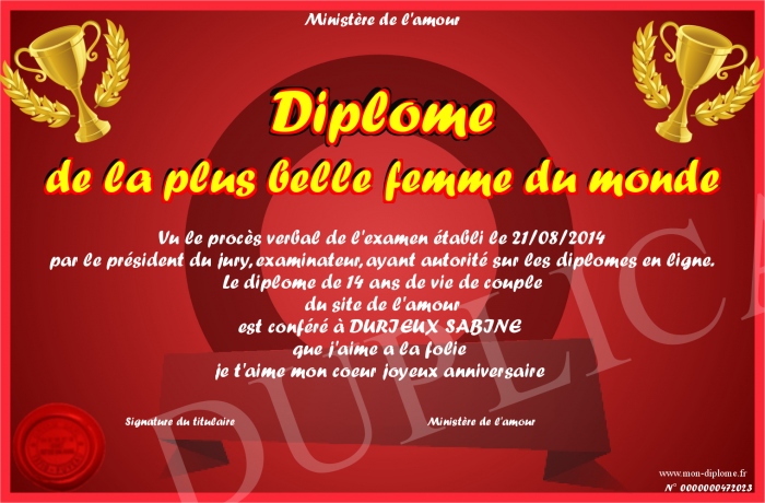 Envoyez par email votre Diplôme de la plus belle femme du monde personalisé