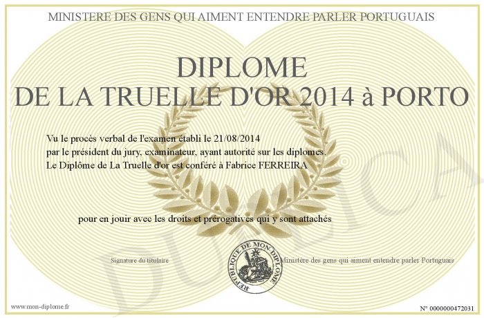 Envoyez par email votre Diplôme de LA TRUELLE D'OR 2014 à PORTO personalisé