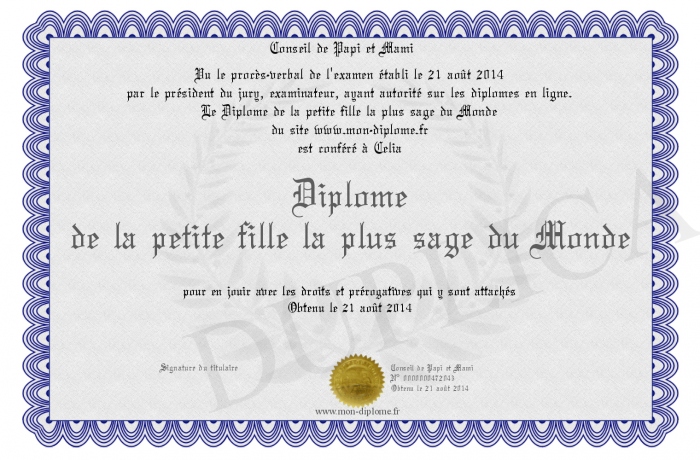 Envoyez par email votre Diplôme de la petite fille la plus sage du Monde personalisé