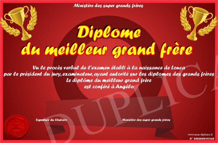 Envoyez par email votre Diplôme du meilleur grand frère personalisé