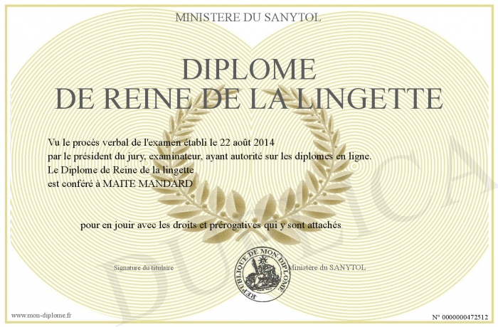 Envoyez par email votre Diplôme de Reine de la lingette personalisé